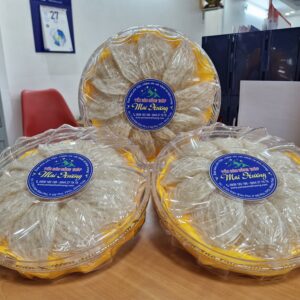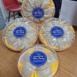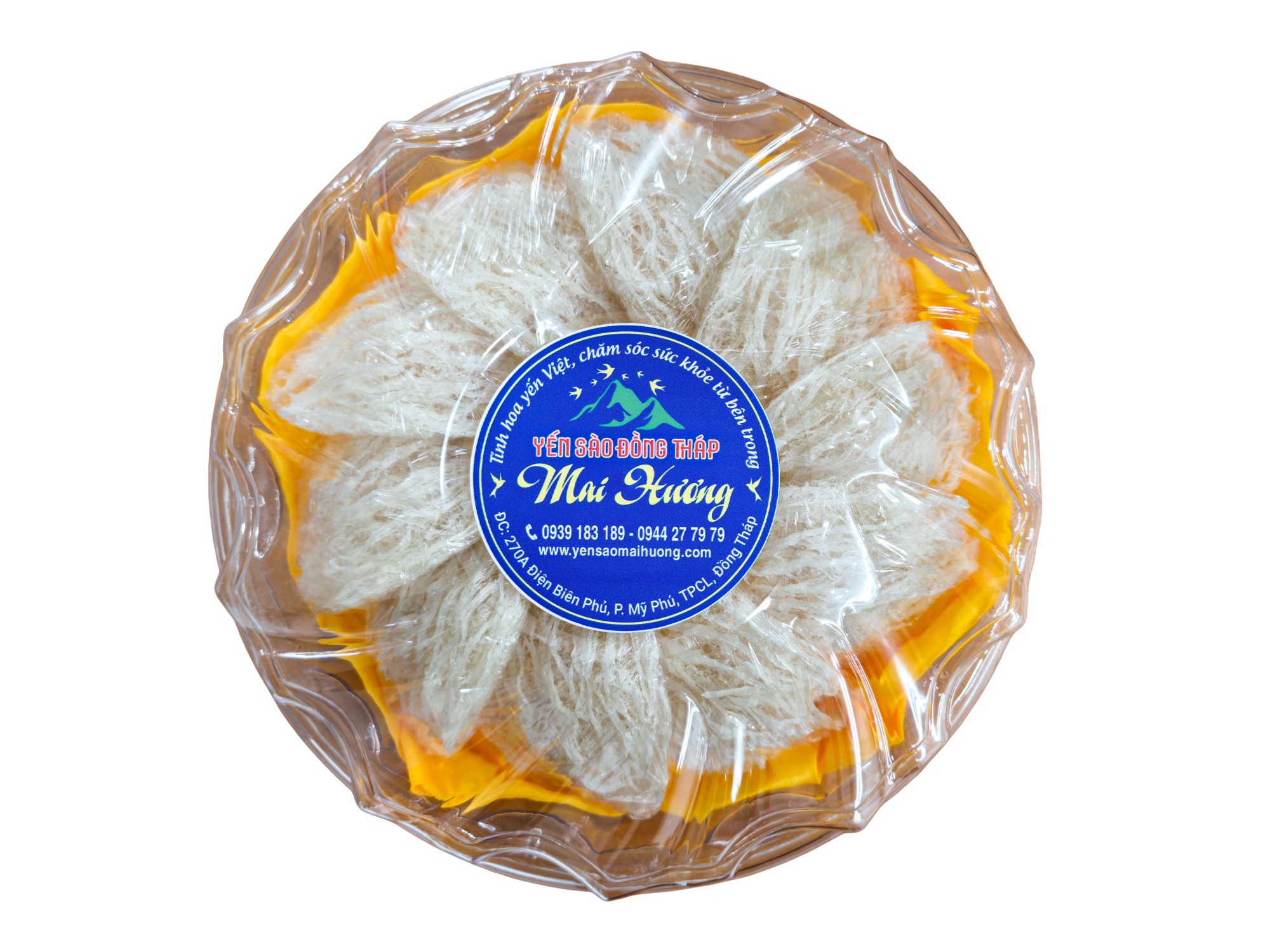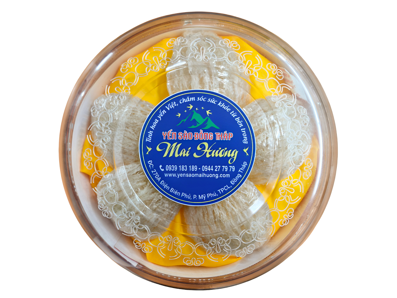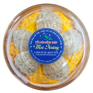 Yến Sào Đồng Tháp Mai Hương là sản phẩm tổ yến được khai thác và chế biến tại vùng đất Đồng Tháp. Sản phẩm được đóng gói trong hộp tròn trong suốt, cho thấy các tổ yến nguyên vẹn (có thể là yến thô hoặc đã tinh chế) được sắp xếp đẹp mắt, thể hiện sự tinh túy và sang trọng.